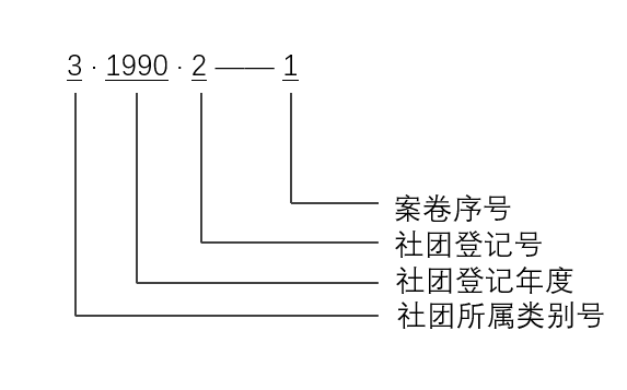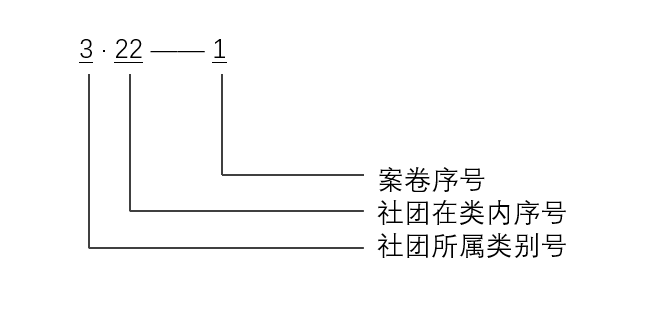 各社团管理机关将各社团分别纳入上述四类之后,再于每类内小开,在同一年度里将社团按登记时间顺序排列,或在每类内按年依登记顺序流水排列。对每一社团的案卷分保管期限,依形成时间进行排列,具体分类编号示意如下: